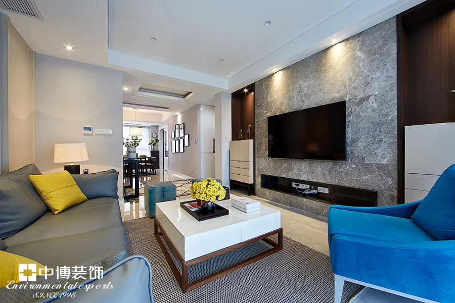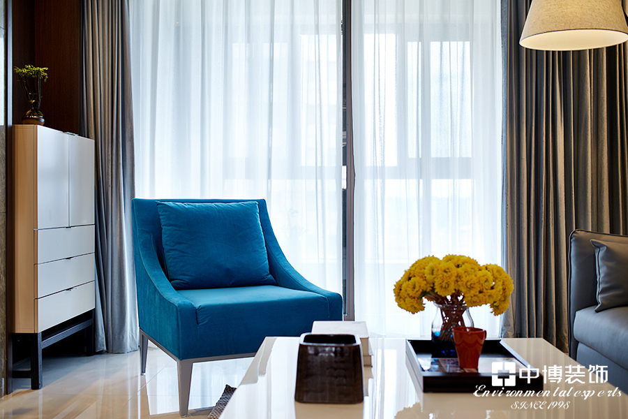 本案设计手法简约,将浪漫的怀旧气息与时尚摩登风格完美结合,深入生活、反复思考、描绘出最丰富浪漫的空间效果。蓝色洋溢着生动,永恒地承载着优雅的美感,昭示着完美无瑕的品质。
