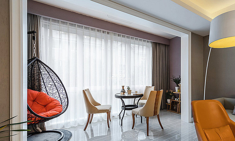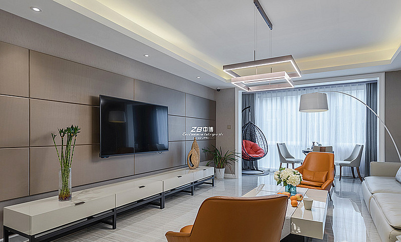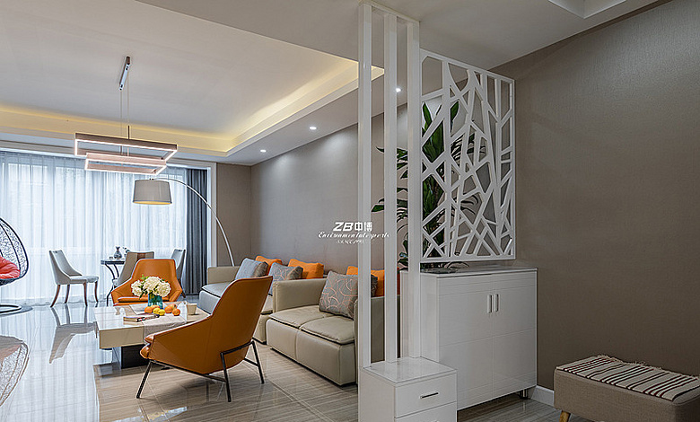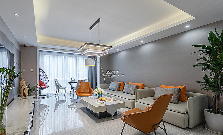客厅在浅色整体主调下,由橙色抱枕、几何图形台灯、橙色单椅点缀,给人带来清爽明快之感,而落地窗让空间布局更加宽敞舒畅,整体给人感觉明亮而又恬静。