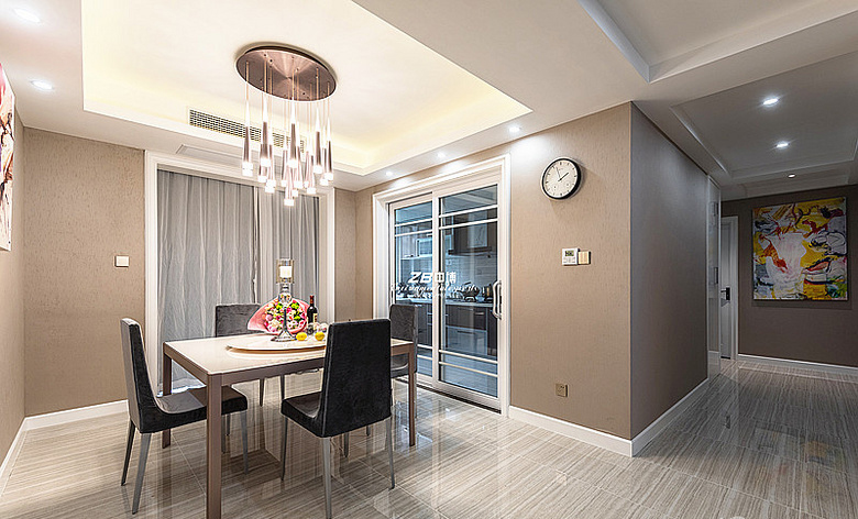 餐厅以木质为主,木地板、木桌椅,配上下垂的吊灯,整体给人一种工业风感觉,干脆利落。同时使得空间极具生机与活力。