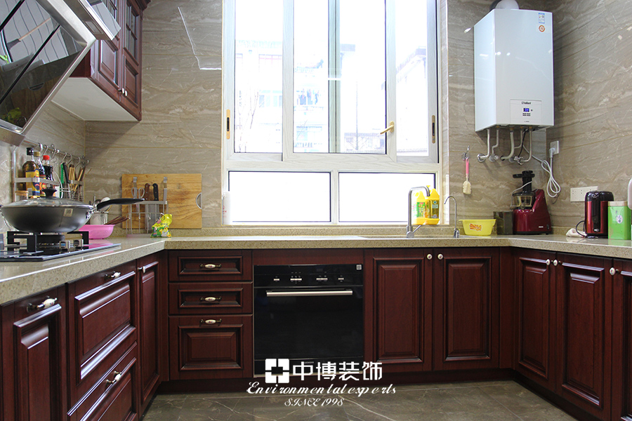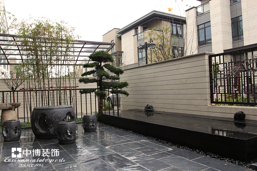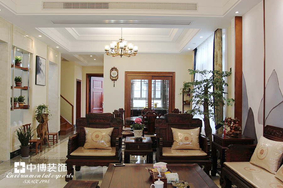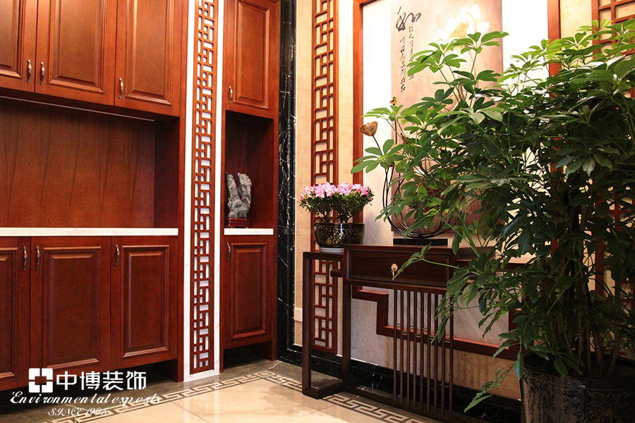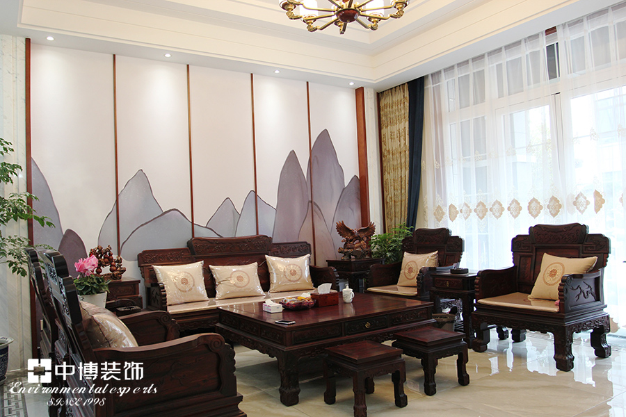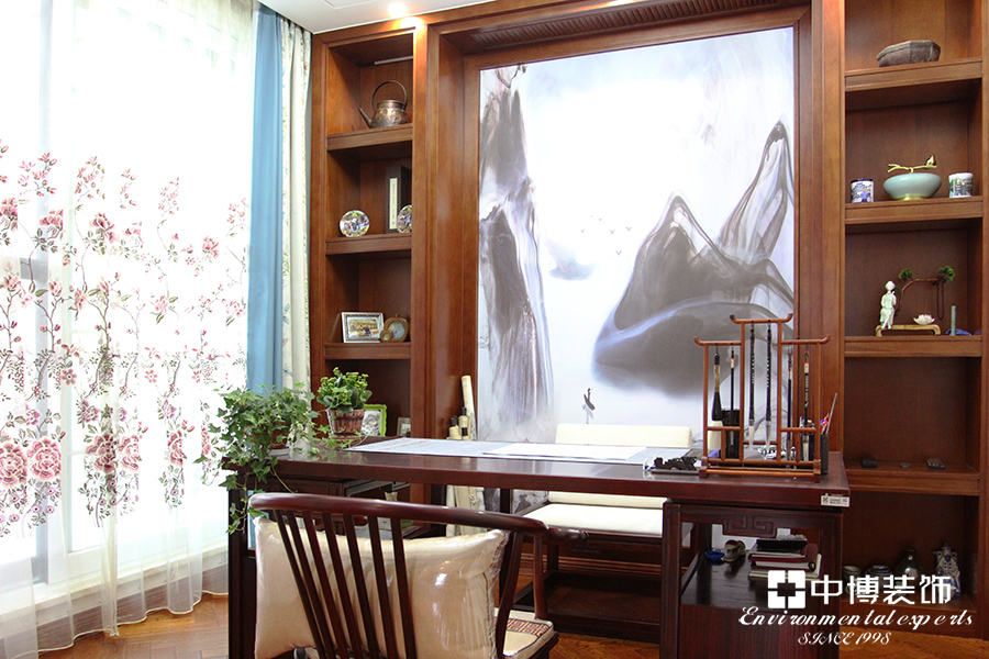 抽象的线条挂画+泼墨山水,整个空间交织着中式的雅致和高贵的静穆。简化的中式线条,刻画着生活的安然,将宁静、雅致的氛围氤氲开来,似抛开尘世的喧扰,给心灵一份安然而宁静的沉淀。
