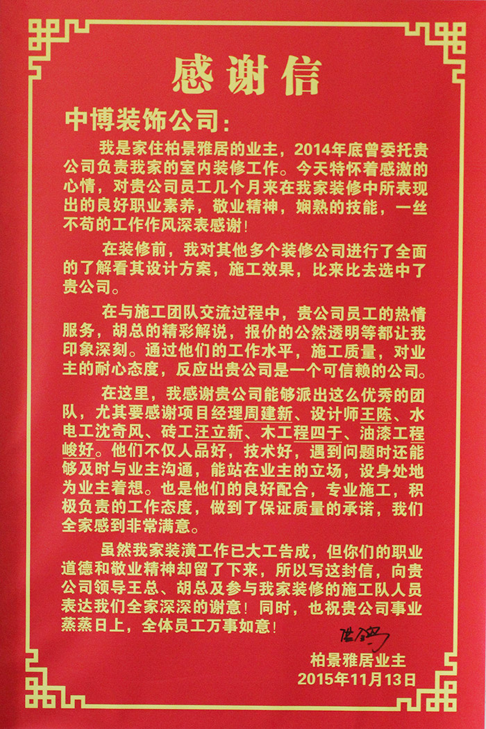 11月13日,栢景雅居洪女士来到中博装饰,向负责设计和施工的王陈设计师、周建新项目经理赠送锦旗,业主对他们的敬业精神以及服务态度感到非常满意和认可。