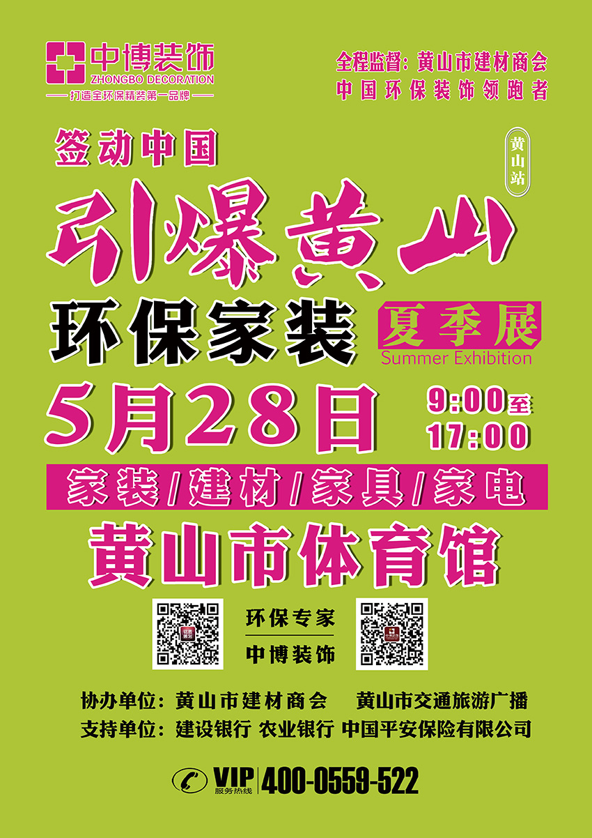 5月28日大型家装建材家居展引爆黄山,23大国际一线家装建材品牌齐聚黄山体育馆,保证全年最低价,买贵全额补差,年中钜惠疯狂来袭!黄山市建材商会、黄山市交通旅游广播全程监督。