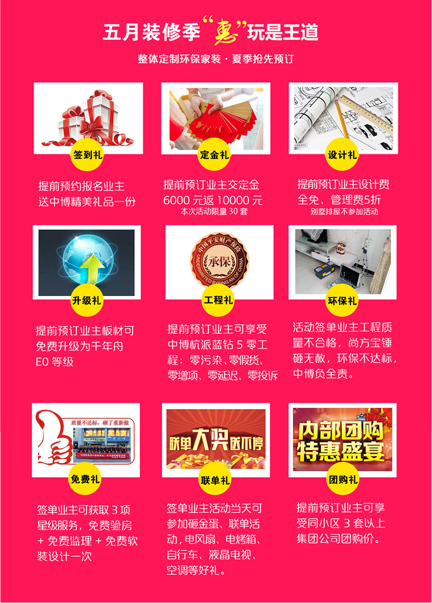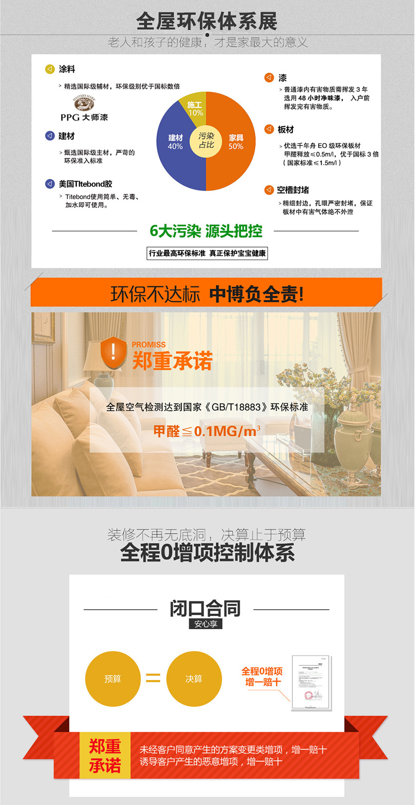 工程礼:签单业主可享受中博5零蓝钻工程:零污染、零假货、零增项、零延迟、零投诉;