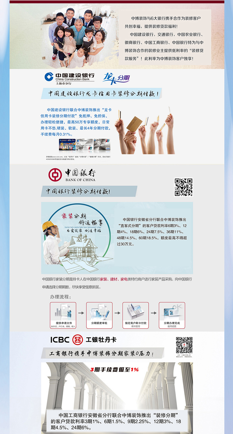 中博装饰携手六大银行战略合作装修贷款,让您的家居梦想一步到位!家装分期“0”利率、“0”手续、“0”抵押,您贷款、我付息,轻松装修“0”压力!