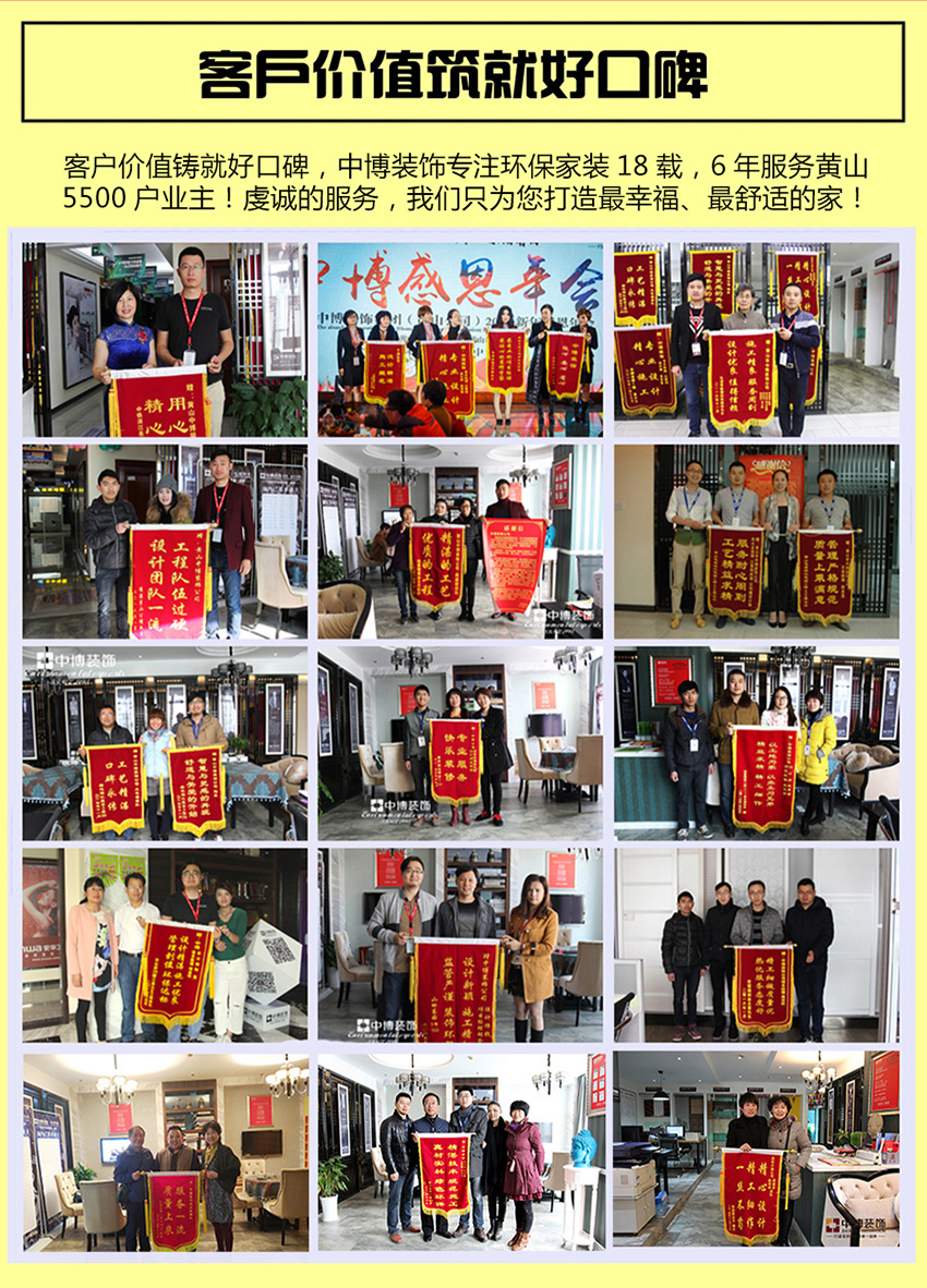 客户价值铸就好口碑,中博装饰专注环保家装18载,6年服务黄山5500户业主!虔诚的服务,我们只为您打造最幸福、最舒适的家!