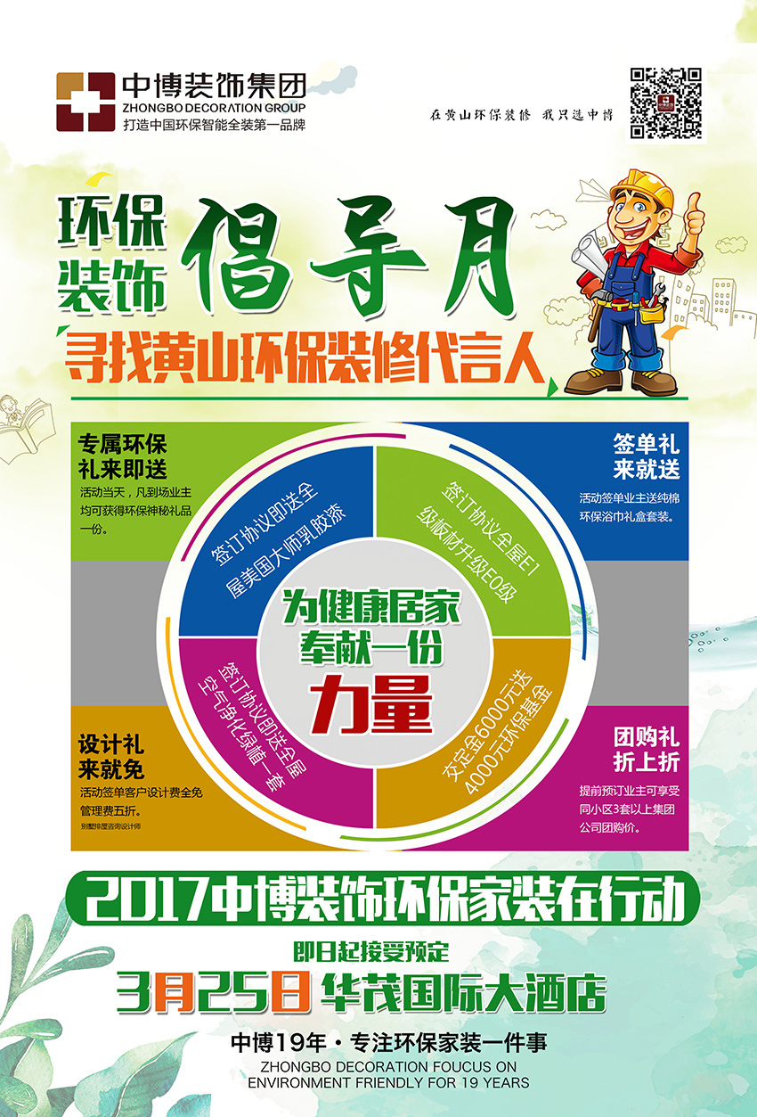 中博装饰“环保装饰倡导月”,寻找黄山环保装修代言人,抢环保装饰基金、享环保大礼包、送全屋美国大师乳胶漆。