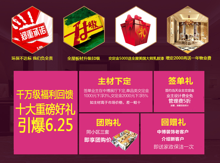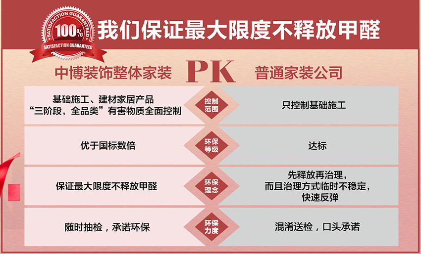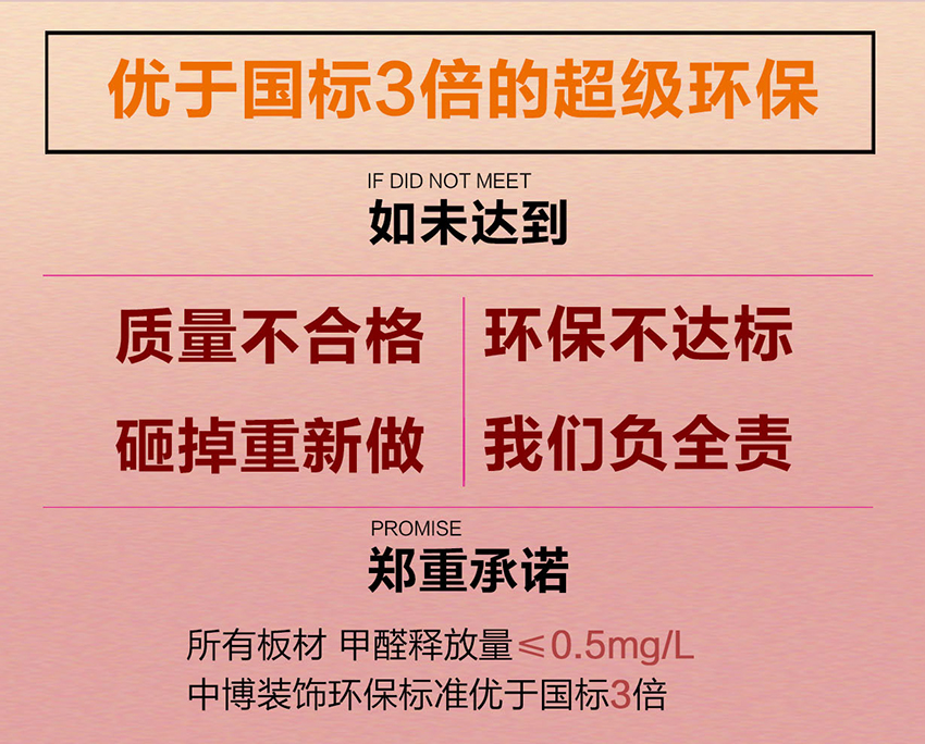 装修有价,健康无价,杜绝装修污染!我们郑重承诺:环保不达标,中博负全责!为您彻底解决环保顾虑,给您一个环保健康的家。