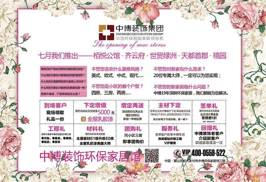 中博装饰网罗栢悦公馆、禧园、齐云府、世贸绿洲、天都首郡全部户型,设计师前期实地考察,针对小区格局特点及业主群体需求提供了多款专业化设计解决方案。现场业主与设计师将深入探讨,共同寻找和定制最适宜的家居环境。