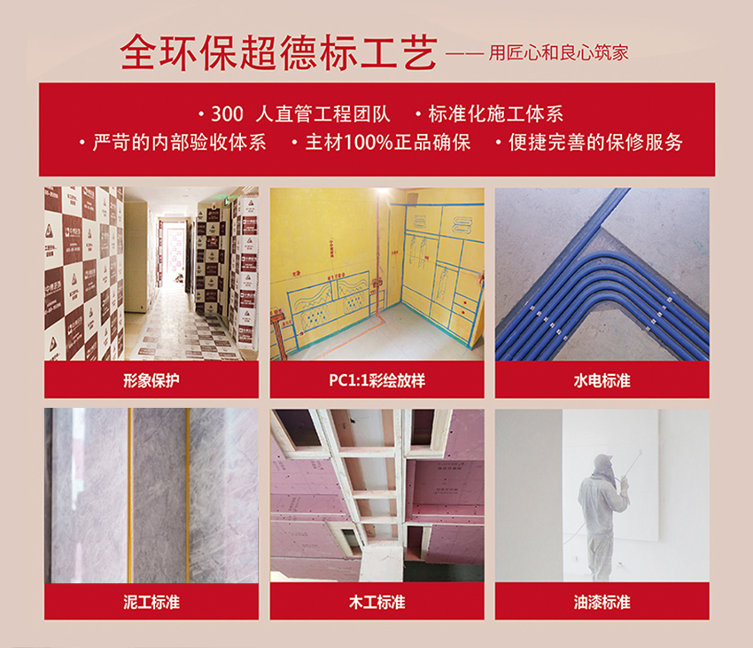 工程质量始终是业主在选择装修公司时的一大难,中博装饰全环保超德标工艺,在工艺上更高的品质要求,让业主放心。
