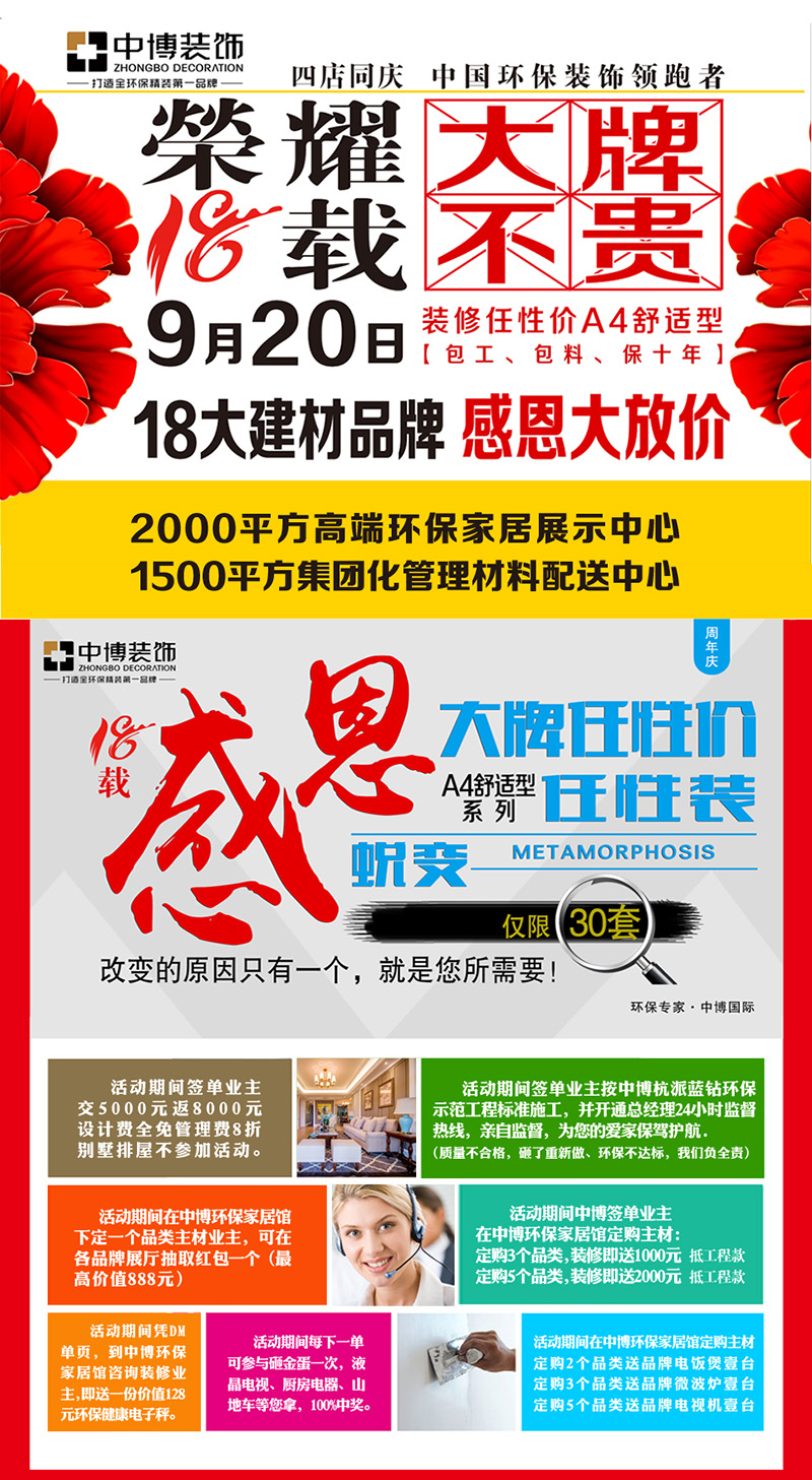 感恩周年庆,中博装饰隆重推出A4舒适型系列,包工、包料、保十年!参加周年庆业主还可享受六大装修钜惠;联购建材更能享受更多优惠;“18周年庆”,全年仅此一次!